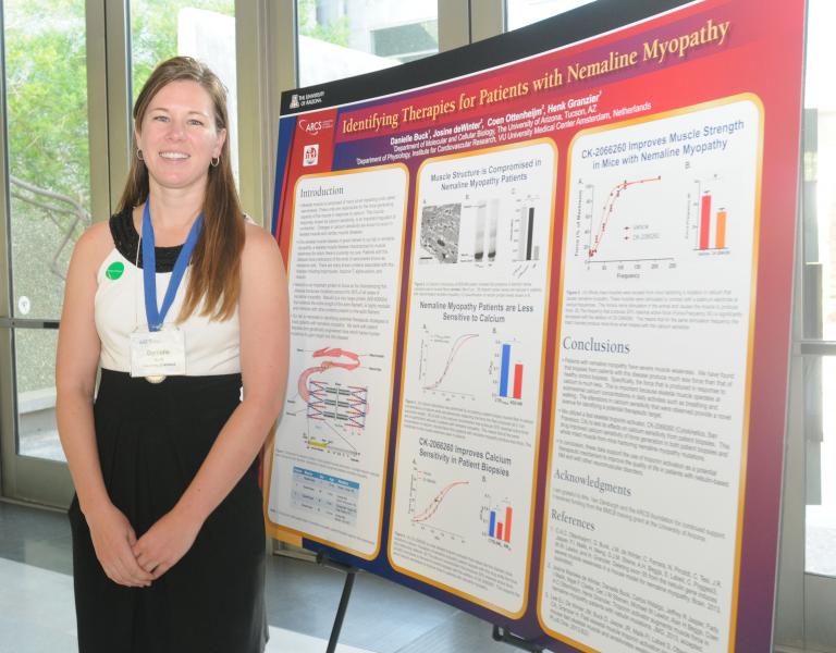 Danielle Buck, an ARCS Phoenix Scholar in 2012-2013 and 2013-2014, works under the direction of Henk Granzier, a University of Arizona professor, who has studied titin for years. Previous studies had shown that alterations in titin are involved in muscular myopathies, but whether these deviations actually cause myopathies, or merely result from them, had remained a mystery.  Danielle has shown that mutations do in fact cause myopathies in skeletal muscles.
